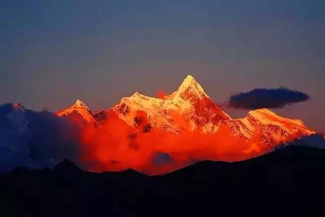 它還有另一個名字“木卓巴爾山”,其巨大的三角形峰體終年積雪,云霧繚繞,從不輕易露出真面目,所以它也被稱為“羞女峰”。南迦巴瓦在藏浯中有多種解釋,一為“雷電如火燃燒”,一為“直刺天空的長矛,還有一為“天山掉下來的石頭”。后一個名字來源于《格薩爾王傳》中的“門嶺一戰(zhàn)”,在這段中將南迦巴瓦峰描繪成狀若“長矛直刺蒼穹”。