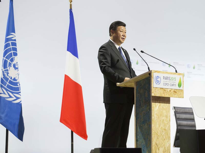 圖為:2015年11月30日,國(guó)家主席習(xí)近平在巴黎出席氣候變化巴黎大會(huì)開(kāi)幕式并發(fā)表題為《攜手構(gòu)建合作共贏、公平合理的氣候變化治理機(jī)制》的重要講話。