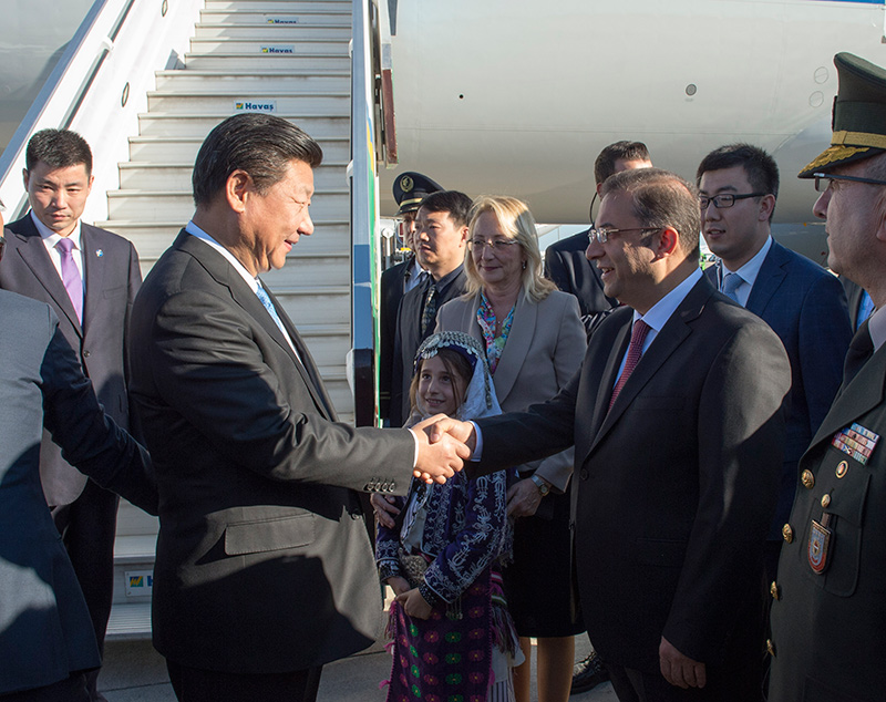圖為:2015年11月14日,國(guó)家主席習(xí)近平抵達(dá)土耳其安塔利亞,應(yīng)土耳其共和國(guó)總統(tǒng)埃爾多安邀請(qǐng),出席二十國(guó)集團(tuán)領(lǐng)導(dǎo)人第十次峰會(huì)。土耳其高級(jí)官員到機(jī)場(chǎng)迎接習(xí)近平主席一行。