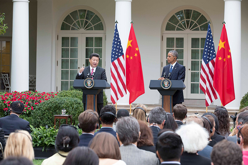 圖為:2015年9月25日,國(guó)家主席習(xí)近平在華盛頓同美國(guó)總統(tǒng)奧巴馬舉行會(huì)談。會(huì)談后,兩國(guó)元首共同會(huì)見(jiàn)記者。
