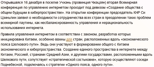 12月16日,第二屆世界互聯(lián)網大會在中國浙江小鎮(zhèn)烏鎮(zhèn)召開,會上提出了“構建網絡空間命運共同體”倡議。中國國家主席習近平出席會議并在大會開幕式上發(fā)言。他強調,各國有必要加強合作解決互聯(lián)網領域發(fā)展不平衡、規(guī)則不健全、秩序不合理等問題。