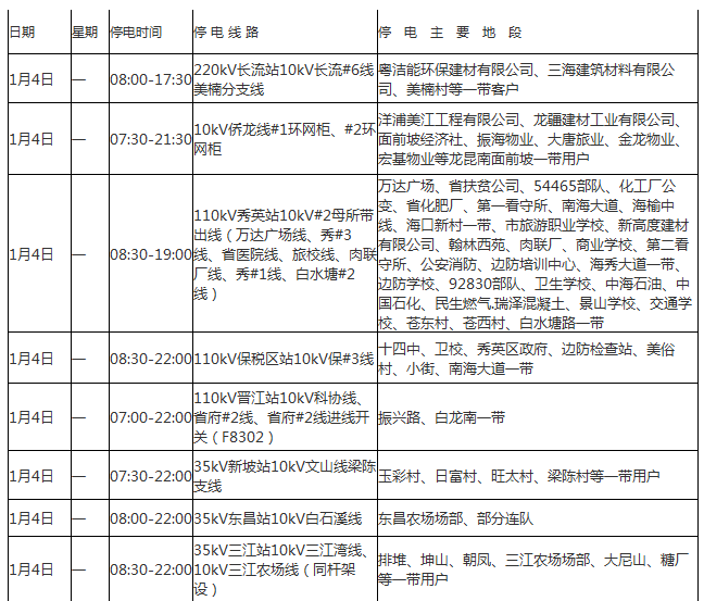 ?诠╇娋纸裉彀l(fā)布2016年1月4日至20日停電公告,以進(jìn)行供電線路改造升級(jí)、設(shè)備消缺維護(hù)。?诓糠志用裼秒妼⑹艿接绊懀(qǐng)?zhí)崆白龊脺?zhǔn)備。