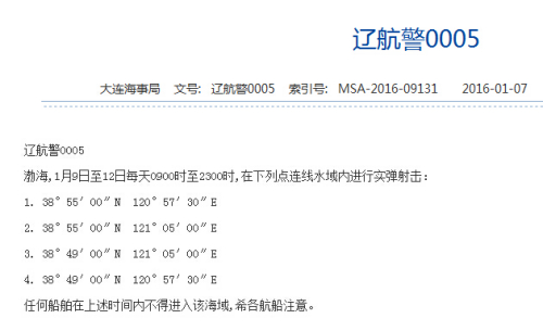 據(jù)遼寧海事局網(wǎng)站消息,11月16日8時(shí)至17時(shí),在渤海北部將執(zhí)行軍事任務(wù),要求期間任何船只不得進(jìn)入該海域。