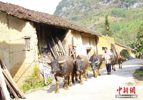 資料圖:2015年12月3日,在地處廣西偏遠(yuǎn)山區(qū)的柳江縣土博鎮(zhèn)世界村世界屯,一名中年人在趕牛。 朱柳融 攝