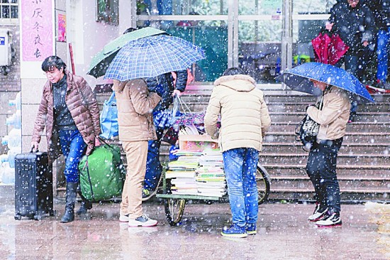 1月22日,杭州下了一場大雪。在浙江大學(xué)紫金港校區(qū)青溪宿舍門口,前來接孩子的母親左右手各提著一件大件行李匆匆走下樓梯。另有多位學(xué)生冒著大雪,趕在寒假離校之前,將舊書捐贈給紅會組織。浙江大學(xué)王佶愷/攝