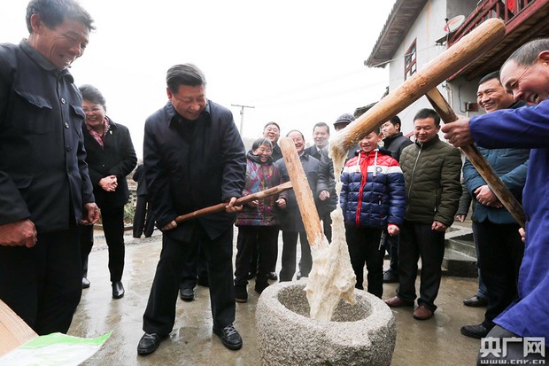在茅坪鄉(xiāng)神山村,紅軍烈士后代左秀發(fā)一家正在準備年貨。總書記來到他家門前,拿起木槌,同村民一起打糍粑。(新華社記者 蘭紅光 攝)