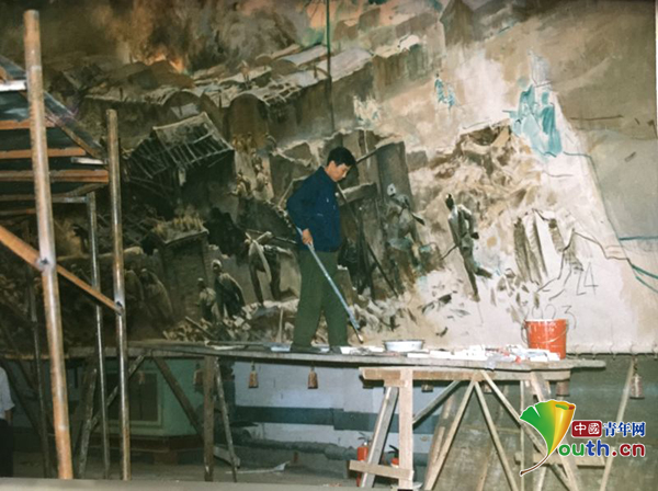 1989年春,王鐵牛在錦州遼沈戰(zhàn)役紀(jì)念館《攻克錦州》全景畫繪制的工作現(xiàn)場。本人供圖