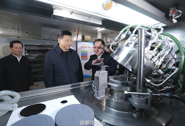習(xí)近平來到南昌大學(xué)國(guó)家硅基LED工程技術(shù)研究中心,走進(jìn)實(shí)驗(yàn)室,觀看產(chǎn)品展示,聽取南昌光谷建設(shè)匯報(bào)。江風(fēng)益團(tuán)隊(duì)19年磨一劍,開辟了LED第三條技術(shù)路線,實(shí)現(xiàn)了產(chǎn)業(yè)化,LED產(chǎn)業(yè)前景廣闊,總書記看了十分高興。他強(qiáng)調(diào),我國(guó)發(fā)展必須依靠創(chuàng)新。掌握核心技術(shù)的過程很艱難,但這條道路必須走。這個(gè)新興產(chǎn)業(yè)大有可為,我對(duì)你們寄予厚望。