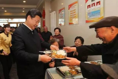 2013年2月4日,習近平來到蘭州一家“虛擬養(yǎng)老院”的養(yǎng)老餐廳,了解有關情況,還端起一個盛滿飯菜的餐盤,走到72歲的老人楊林太面前,輕輕送上,請他用餐。
