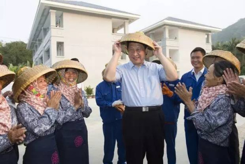 2013年4月8日至10日,中共中央總書記、國家主席、中央軍委主席習近平在海南考察工作。9日下午,習近平在亞龍灣蘭德玫瑰風情產業(yè)園高興地戴上黎族群眾遞上的斗笠。