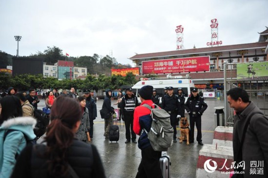 民警在護(hù)送2015年最后一波客流平安返回。