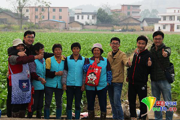 電商創(chuàng)業(yè)者尹然平(右一)及他的團(tuán)隊與農(nóng)民在一起。 尹然平供圖
