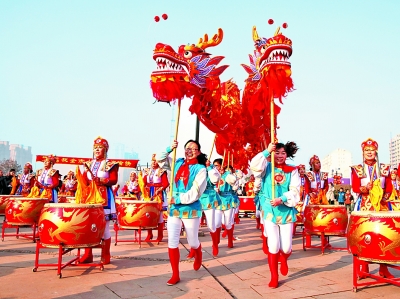 為歡慶猴年春節(jié),農(nóng)歷正月初一,河南省商丘市“紅火過大年”民俗文化表演系列活動在該市睢陽區(qū)、梁園區(qū)等區(qū)縣同時舉行。圖為睢陽區(qū)文藝表演宣傳隊帶來的擊鼓、舞龍、花傘秧歌等獨具地方民俗特色的表演。光明日報記者 閆匯芳攝