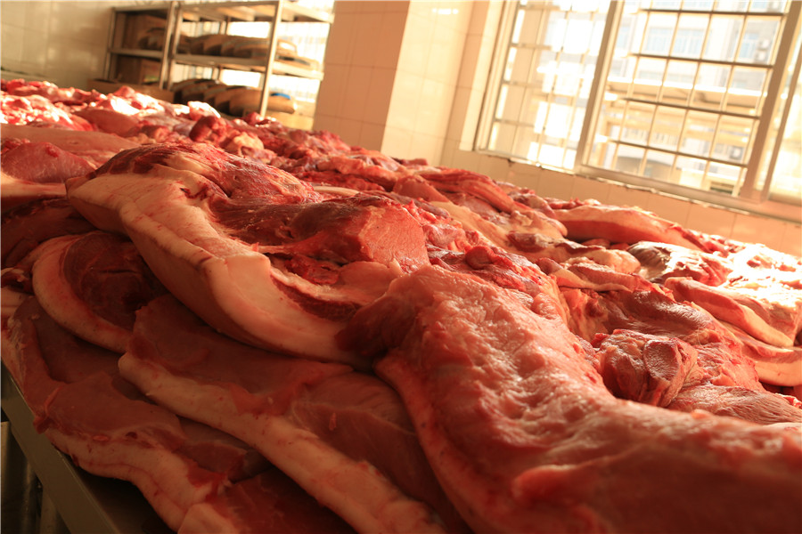為服刑人員準備的豬肉整整齊齊碼放在菏澤監(jiān)獄監(jiān)區(qū)餐廳里,以備春節(jié)食用
