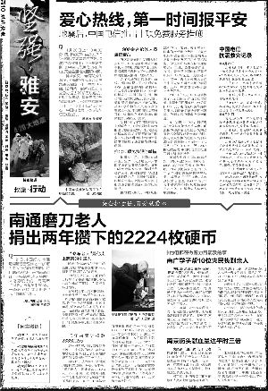 吳錦泉是土生土長(zhǎng)的南通市港閘區(qū)人,是南通市最年長(zhǎng)的紅十字志愿者。如今雖然已經(jīng)87歲高齡,老人卻幾乎還是一天不落地準(zhǔn)時(shí)出門,在路口支起攤子。每次磨刀僅有幾元收入,老人省著攢著,攢到一定數(shù)目,基本悉數(shù)又捐了出去。老人一個(gè)月的收入維持在1400至2000元之間,但開銷卻幾乎從不超過(guò)400元!拔乙粋(gè)人,花不了多少錢,能存下來(lái)多少,就捐多少!崩先苏f(shuō)。2008年,汶川地震時(shí),老人捐款1000元;2010年,玉樹地震時(shí),老人捐款1000元;2013年,他向四川蘆山地震災(zāi)區(qū)捐款1966.2元。去年,他又捐給14歲的白血病女孩600元,捐給紅十字會(huì)11840多元……累計(jì)至今,這位磨刀老人的捐款,已超過(guò)4萬(wàn)元。