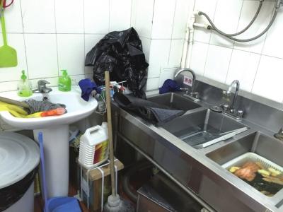 在廚房的清洗池內(nèi),一個(gè)池子用于刷地墊,旁邊的池子浸泡著箅子和關(guān)東煮原料。