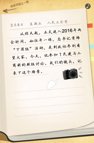人民日?qǐng)?bào)社中央廚房推出的《兩會(huì)日記:跟著總書記聽會(huì)》,以人民日?qǐng)?bào)記者日記的形式,逐日記載了習(xí)總書記的參會(huì)日程。點(diǎn)開日記,一天一頁,除了用文字記錄習(xí)總書記的兩會(huì)活動(dòng),還嵌有習(xí)總書記的講話要點(diǎn)、現(xiàn)場(chǎng)照片等,有的地方還有習(xí)總書記的聲音。逐日翻過,最后呈現(xiàn)的就是一本合起來的日記本的形象。這的確不是一本普通的日記,它的每一頁都值得細(xì)細(xì)咀嚼。