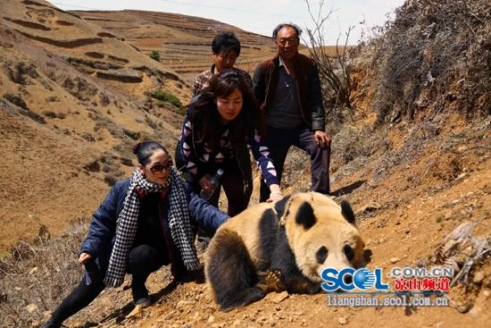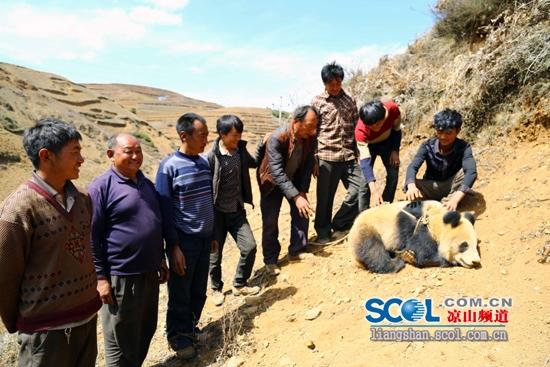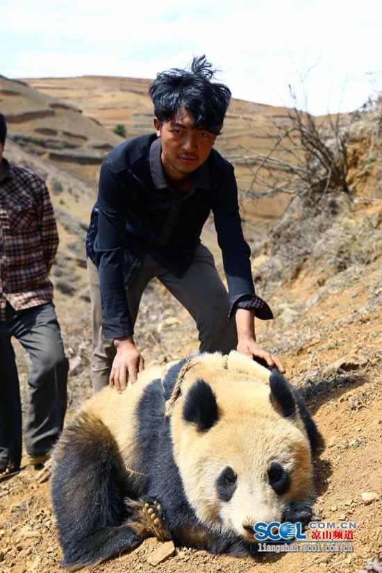 由于大熊貓是在村莊內(nèi)發(fā)現(xiàn)的,村子里有村民們養(yǎng)的10余只攆山狗(獵狗),怕大熊貓跑出去,被村里的獵狗咬傷或被不法人員獵捕,沙馬偉哈立即向社長(zhǎng)沙馬爾一匯報(bào),沙馬爾一馬上給村委會(huì)主任吉古拉洛和村支部書(shū)記麻卡偉吉匯報(bào),再逐一匯報(bào)到鄉(xiāng)上、縣里。沙馬偉哈立即通知沙馬比古、沙馬吉呷、沙馬吉偉、村委會(huì)主任吉古拉洛和村支部書(shū)記麻卡偉吉等前來(lái),層層把大熊貓圍住保護(hù)起來(lái),可大熊貓又到處亂串,村民們實(shí)在沒(méi)辦法就找來(lái)兩條繩子把大熊貓拴住,讓其別再到處亂跑亂串。