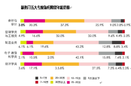 數(shù)據(jù)表明,由于海歸留學(xué)背景與外企工作環(huán)境相吻合,反差較小,更容易適應(yīng)。此外,外企薪資較高,使得留學(xué)回國(guó)人員對(duì)外資企業(yè)尤為中意。其中,薪資的高低,則需因人而異。反觀,一向受?chē)?guó)內(nèi)求職者追捧的穩(wěn)定性極高的國(guó)有企業(yè),海歸期望值反倒明顯降低。另外,在海外留學(xué)生中,超五成就讀商科,而就讀商科中,超七成就讀金融相關(guān)專業(yè)。因此,海歸就業(yè)多集中于金融業(yè),排名第一。然而,隨著電商、“互聯(lián)網(wǎng)+”等行業(yè)的興起,其領(lǐng)域也吸引了大量資金和人才,則同樣備受海歸的青睞。無(wú)論是扎堆行業(yè),還是扎堆企業(yè),其競(jìng)爭(zhēng)程度都值得海歸警醒。