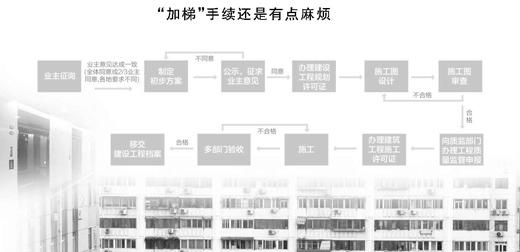上海市《增設(shè)電梯的實(shí)施流程圖》總共有13個(gè)步驟,但實(shí)際操作起來起碼有40多個(gè)小流程,建委、規(guī)劃、房管、綠化、消防……成功“加梯”的上海怒江苑小區(qū)總共蓋了46個(gè)圖章。