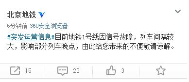 央廣網(wǎng)北京4月17日消息 據(jù)“北京地鐵”官方微博消息,目前地鐵1號(hào)線因信號(hào)故障,列車間隔較大,影響部分列車晚點(diǎn)。