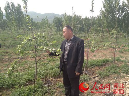 圖為河北省保定市易縣牛崗鄉(xiāng)臺底村黨支部書記牛全江在查看蘋果樹長勢。孫逸樺 攝