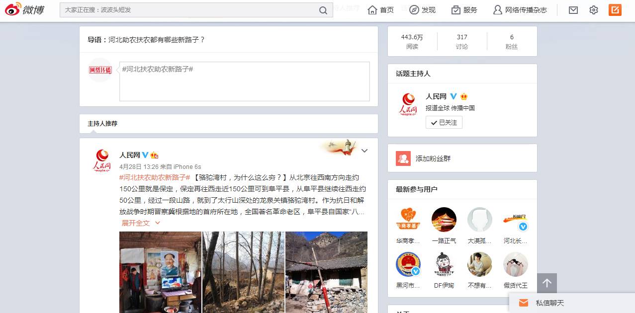 兩微一網(wǎng)聯(lián)動(dòng)作戰(zhàn)。除網(wǎng)站專題,還開設(shè)微博話題#美麗河北進(jìn)行時(shí)#、#河北扶農(nóng)助農(nóng)新路子#,隨時(shí)隨地記錄“走轉(zhuǎn)改”途中的所見所聞,其中人民網(wǎng)微博話題#河北扶農(nóng)助農(nóng)新路子#閱讀量突破400萬。