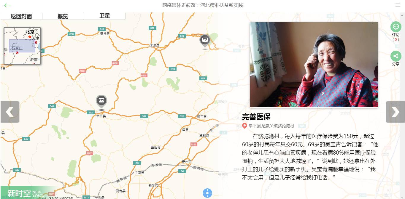 H5炫酷呈現(xiàn)。新華網(wǎng)制作的《網(wǎng)絡(luò)媒體走轉(zhuǎn)改:河北精準(zhǔn)扶貧新實(shí)踐》H5,通過地圖坐標(biāo),展現(xiàn)媒體記者所到站點(diǎn);長城網(wǎng)的《‘情義哥’帶你看世園會(huì)》H5,圖片搭配文字,用活潑吸睛的方式簡單明了地介紹世園會(huì)園區(qū)場景與功能。
