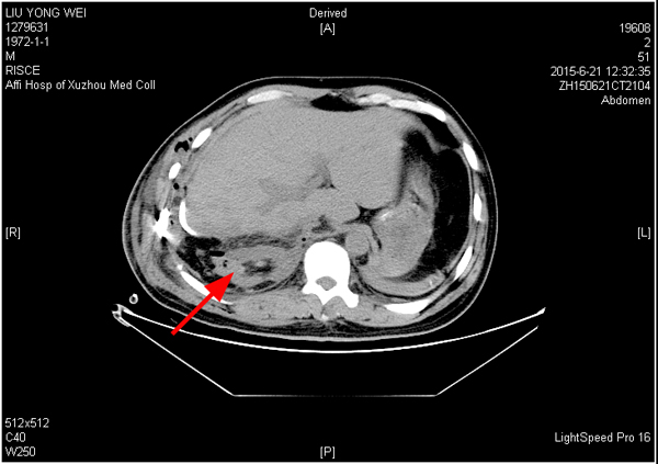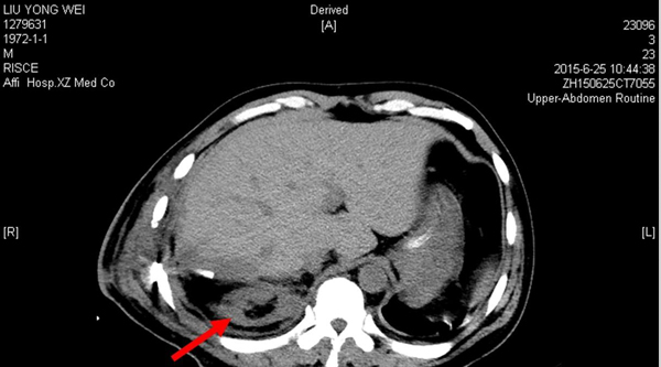 圖一 2015年6月21日(術(shù)后第1天)CT,右腎如箭頭所示。