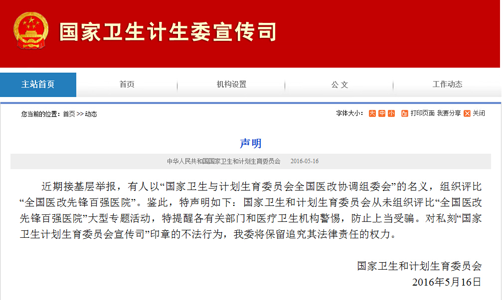 央廣網(wǎng)5月16日消息 5月16日,國(guó)家衛(wèi)計(jì)委官網(wǎng)發(fā)布聲明稱,該委從未組織評(píng)比“全國(guó)醫(yī)改先鋒百?gòu)?qiáng)醫(yī)院”大型專題活動(dòng)。