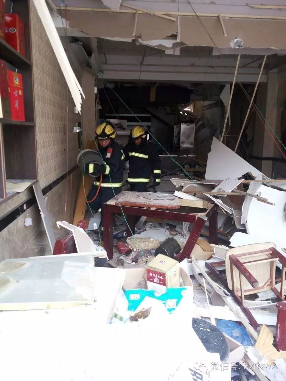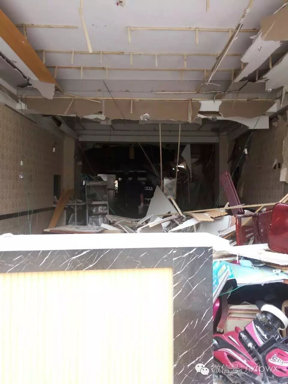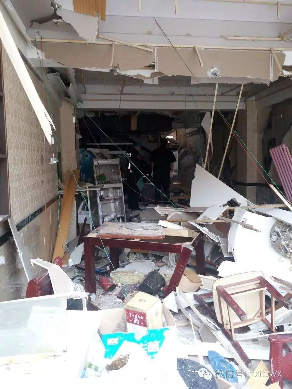 接警后,銀川消防支隊永寧中隊趕赴處置,現(xiàn)場圍觀了大量群眾,餐廳門窗均被炸飛,散落在街道上。餐廳內(nèi)部一片“混亂”,吊頂、桌椅、家電支離破碎,堆積在一起。