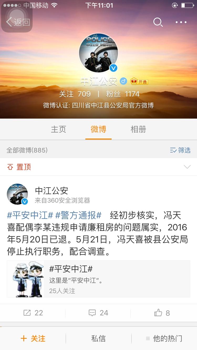 5月23日晚,中江公安通過微博發(fā)布“網(wǎng)曝中江交警副大隊(duì)長(zhǎng)占用廉租房”最新調(diào)查情況,稱經(jīng)初步核實(shí),中江交警大隊(duì)副大隊(duì)長(zhǎng)馮天喜配偶李某違規(guī)申請(qǐng)廉租房的問題屬實(shí),2016年5月20日已退。
