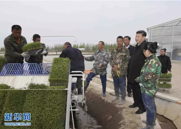 5月24日上午,習(xí)近平在撫遠市玖成水稻種植合作社察看機械插秧。 新華社記者 蘭紅光 攝