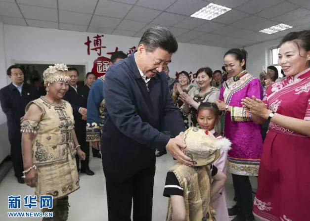 5月24日下午,習(xí)近平在佳木斯市同江市八岔赫哲族鄉(xiāng)八岔村同正在進行伊瑪堪說唱教學(xué)的村民們親切交流。 新華社記者 蘭紅光 攝