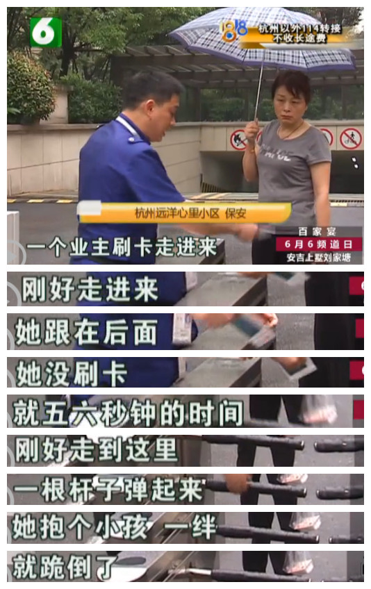 監(jiān)控畫面里,范先生的姑姑一只手抱著孩子,撐著傘,另一只手拎著菜,經(jīng)過(guò)道閘時(shí),被絆了一下,之后跪倒在地上。