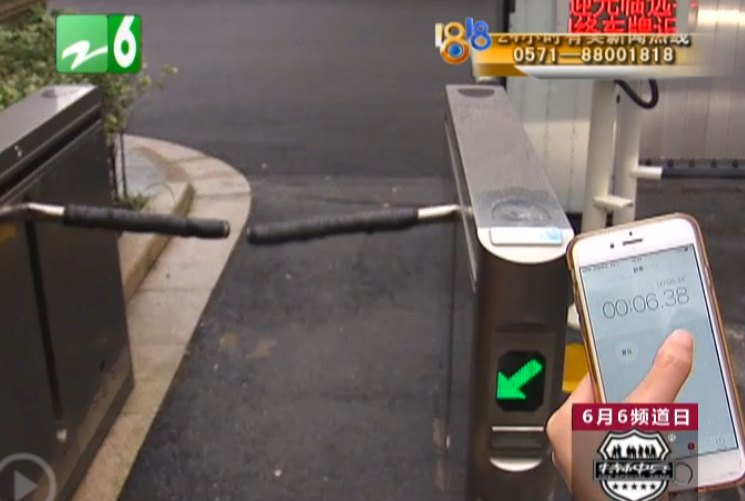 小區(qū)的門禁通道,有兩根桿子攔著,平時(shí)桿子是升起來(lái)的,刷卡后,桿子才落下,記者拿出手機(jī)計(jì)算了一下,刷卡之后,桿子落下到升起,差不多有六秒鐘的時(shí)間。