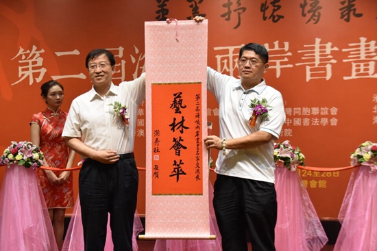 北京市臺(tái)灣同胞聯(lián)誼會(huì)黨組書(shū)記王蘭棟代表主辦方接受了國(guó)民黨主席洪秀柱特為此次畫(huà)展題寫(xiě)的“藝林薈萃”條幅。該展覽為期5天,將于6月28日結(jié)束。