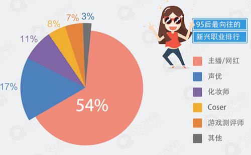 QQ瀏覽器于近期發(fā)布的《95后迷之就業(yè)觀!》大數(shù)據(jù)報告顯示,面對“史上最難就業(yè)季”,伴隨網(wǎng)絡時代應運而生的各類新興職業(yè)成為95后理想的全新畢業(yè)選擇(選擇率超8%),其中主播/網(wǎng)紅獨得專寵,選擇比例高達54%。