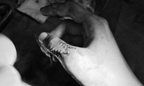 岳先生大拇指受傷縫了數(shù)針。