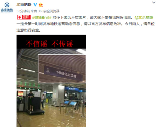 今日,網(wǎng)傳一張1號線公主墳站進水的照片,北京地鐵公司官方微博表示,網(wǎng)傳圖片為不實圖片,請大家不要相信網(wǎng)傳信息。北京地鐵一定會第一時間發(fā)布地鐵運營動態(tài)信息,請以官方發(fā)布信息為準。