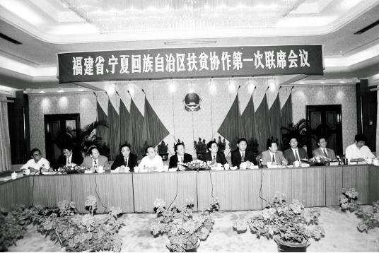 1996年11月,閩寧扶貧協(xié)作第一次聯(lián)席會議在福建召開,會議確定:兩省區(qū)政府每年舉行一次聯(lián)席會議;建立扶貧協(xié)作發(fā)展基金;從沿海5個省轄市中選出8個經(jīng)濟實力較強的縣(市、區(qū)),對口幫扶寧夏8個國家扶貧開發(fā)工作重點縣;互派掛職干部;部門對口協(xié)作。圖為習近平(右五)出席閩寧扶貧協(xié)作第一次聯(lián)席會議。 新華社記者 劉泉龍 攝
