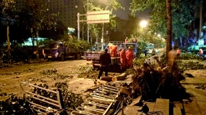 昨天凌晨零點左右,北京晨報記者到達日壇路南口。只見一排高大的楊樹都已經(jīng)倒地,其中大部分都是連根拔起,楊樹的樹干已經(jīng)砸在了主路上。記者看到,幾名身穿橘色工作服的園林部門工作人員先將樹干鋸斷,再分次裝上車子拉走。此外,一輛停放在樹下的灰色轎車被倒地的大樹砸到了車頂。車子的頂部已經(jīng)凹了進去,左側(cè)兩個車門已經(jīng)無法關(guān)閉,擋風玻璃也已經(jīng)破碎。