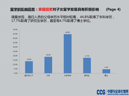 中國(guó)與全球化智庫(kù)(CCG)與北京海威時(shí)代教育咨詢有限公司聯(lián)合發(fā)布的《2016中國(guó)海歸就業(yè)調(diào)查報(bào)告》顯示,家庭因素,尤其是父母的受教育水平對(duì)子女出國(guó)發(fā)展具有重要影響。調(diào)查發(fā)現(xiàn),海歸人員的父母學(xué)歷水平相對(duì)較高, 44.8%取得了本科學(xué)歷,17.7%取得了研究生學(xué)歷,甚至有4.7%取得了博士學(xué)位。