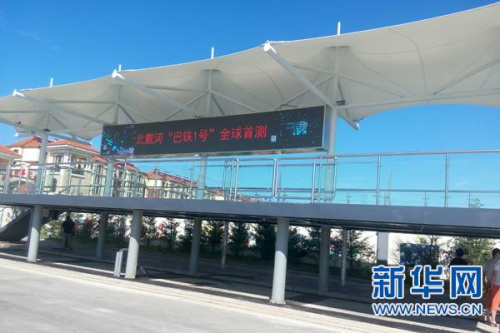 站臺(tái)的電子屏上顯示是“北戴河‘巴鐵1號(hào)’全球首測(cè)” 新華網(wǎng)魏會(huì)博 攝
