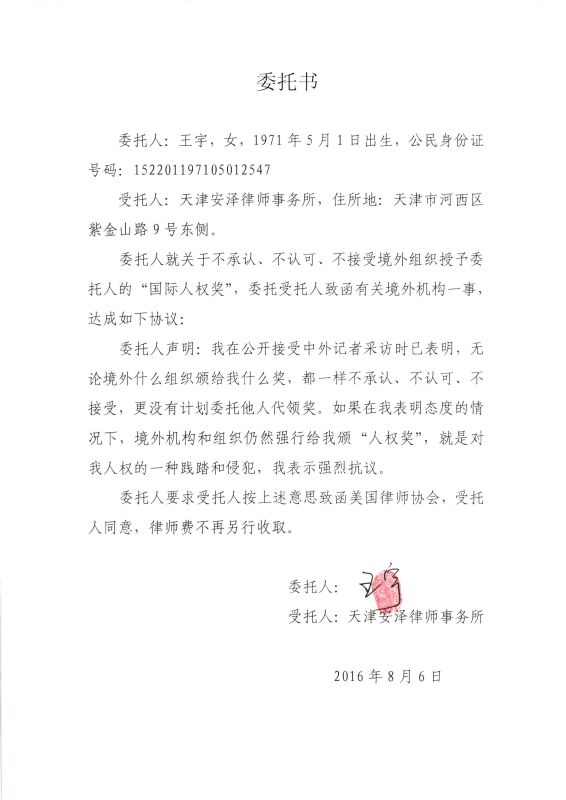 《環(huán)球時報》了解到,8月6日,王宇委托天津安澤律師事務所律師朱丹、倪秀紅向美國律師協(xié)會發(fā)送律師函,要求美國律師協(xié)會立即停止強行給王宇頒發(fā)所謂“人權(quán)獎”的侵權(quán)行為。