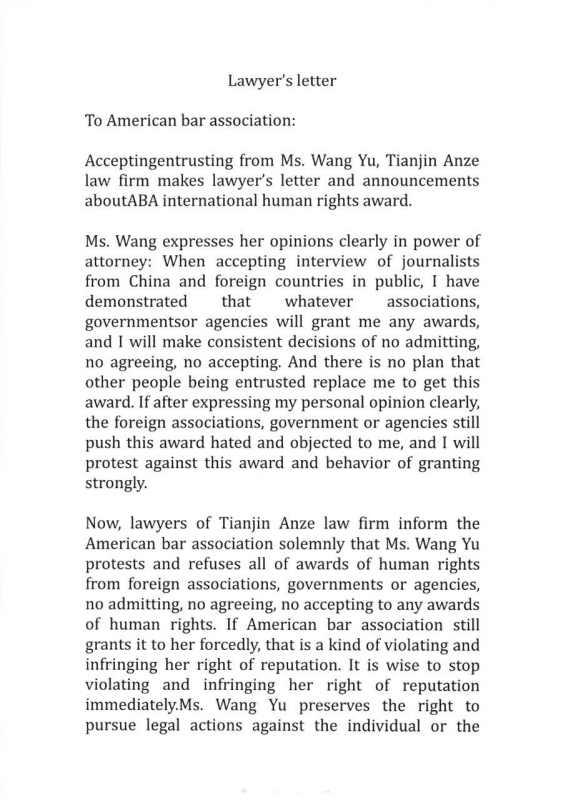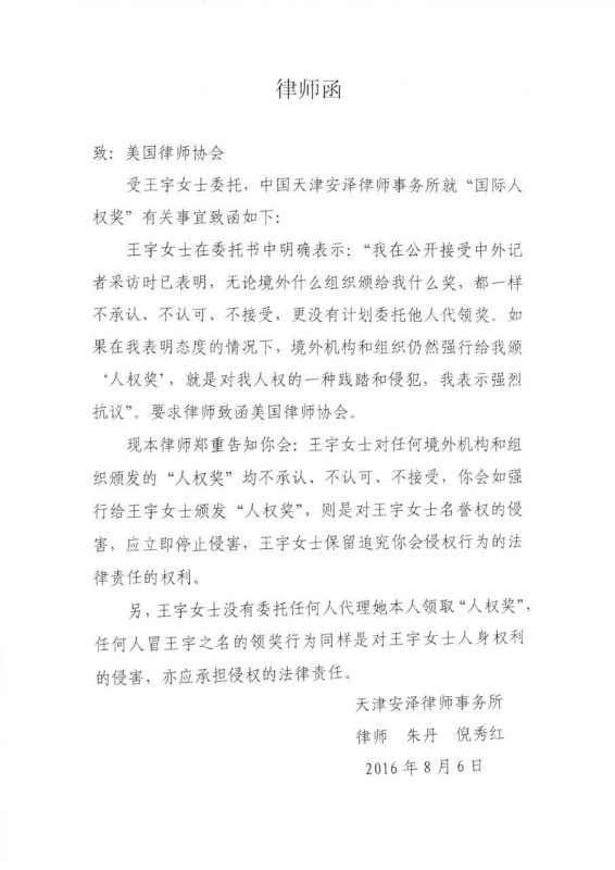 該律師函稱,“本律師鄭重告知美國律師協(xié)會:王宇已多次公開表明對境外機構(gòu)和組織頒發(fā)的‘人權(quán)獎’不承認、不認可、不接受,如你會強行給王宇女士頒發(fā)‘人權(quán)獎’,是對王宇女士名譽權(quán)的侵害,應立即停止侵害,王宇女士保留追究你會侵權(quán)行為法律責任的權(quán)利。”