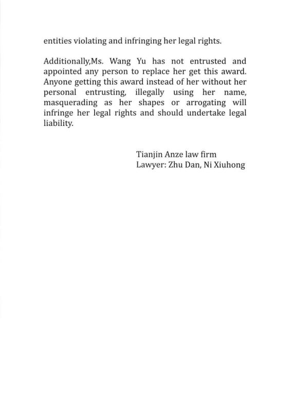 朱丹、倪秀紅律師在律師函里還特別強調(diào),王宇從未委托他人代理她本人領(lǐng)取“人權(quán)獎”,任何人冒王宇之名領(lǐng)獎的行為同樣是對王宇人身權(quán)利的侵害,要承擔侵權(quán)的法律責任。