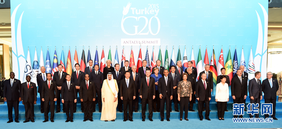 2015年11月15日,二十國集團(tuán)領(lǐng)導(dǎo)人第十次峰會在土耳其安塔利亞舉行。這是習(xí)近平主席同與會領(lǐng)導(dǎo)人合影。 新華社記者 李學(xué)仁 攝