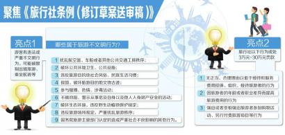 未來,市民出游若遇強迫購物,可要求旅行社墊付退貨款。同樣,游客若有不文明行為,在乘坐航班時可能會受限制……8月2日,華西都市報記者從國家旅游局官網(wǎng)獲悉,《旅行社條例(修訂草案送審稿)》(下簡稱《條例》)正在公開征求意見,它對游客不文明行為、旅行社不合理低價等問題均作出了相應(yīng)規(guī)定。
