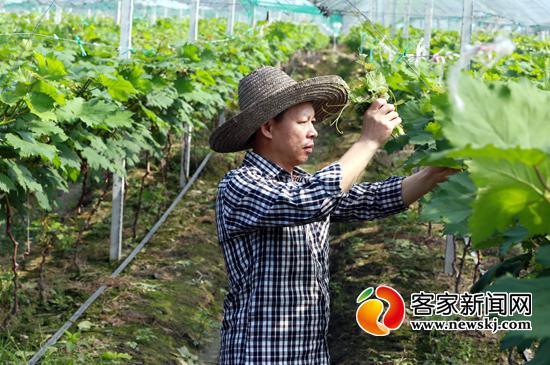 安遠(yuǎn)農(nóng)民梅林山先前靠伐木種菇為生,現(xiàn)在他放下柴刀轉(zhuǎn)投生態(tài)農(nóng)業(yè)。圖為工人在梅林山的葡萄園里給葡萄剪枝。